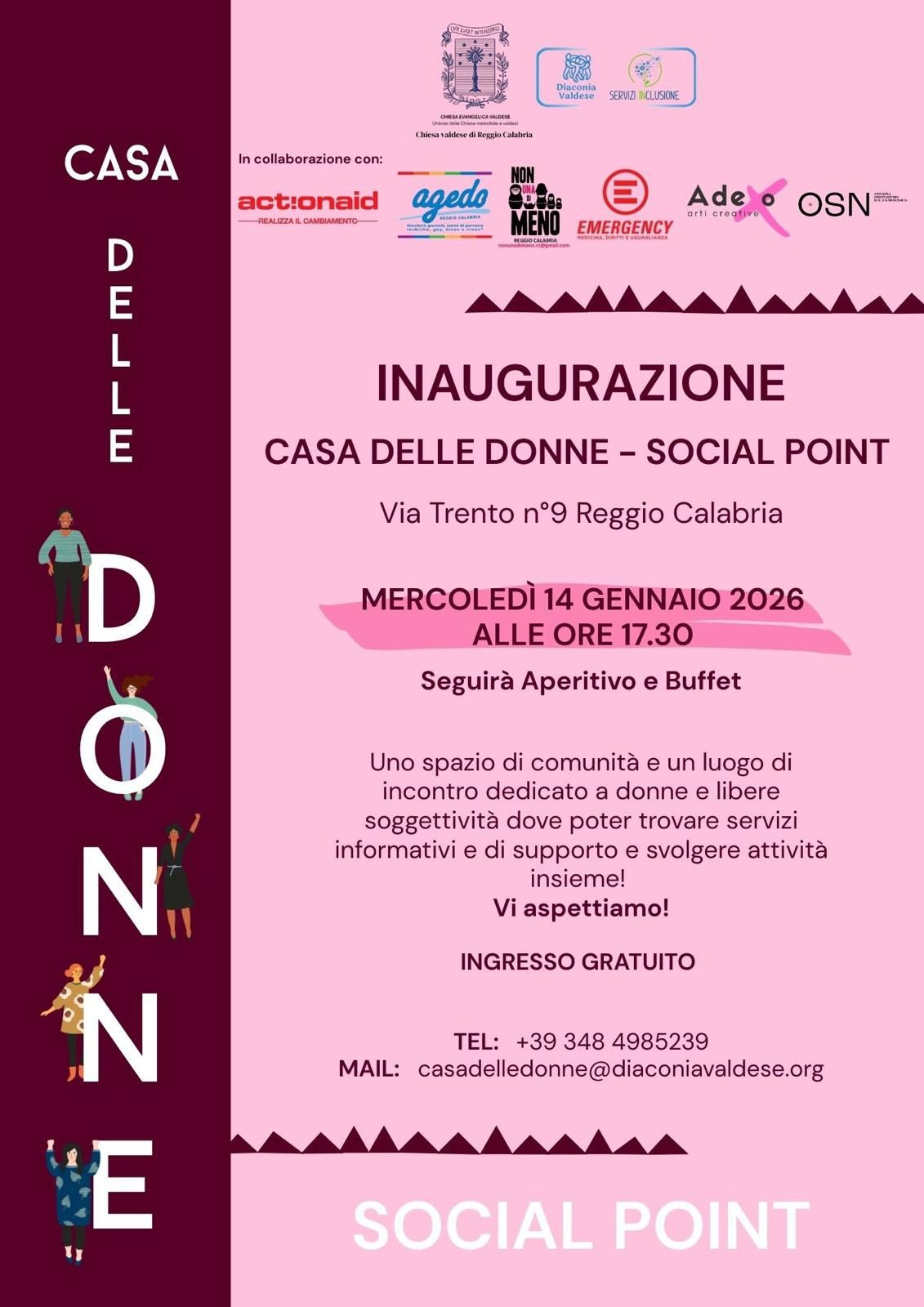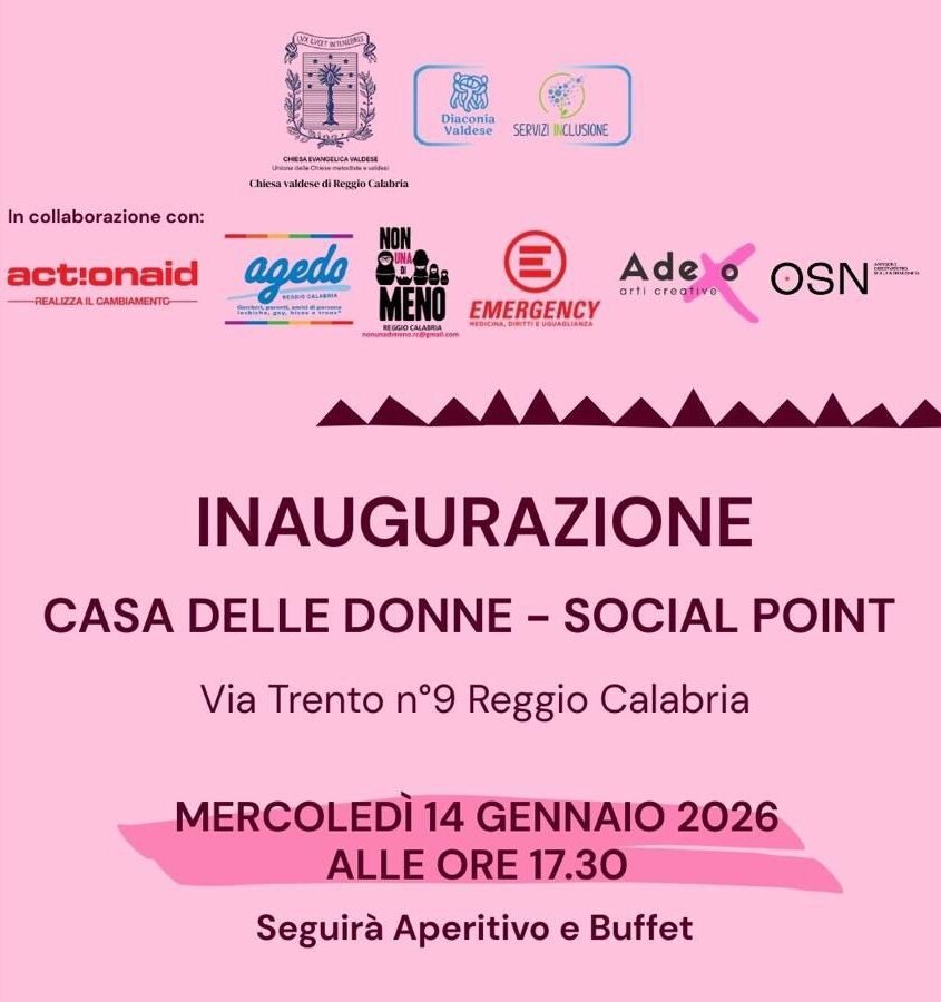 La Diaconia Valdese e la Chiesa Valdese di Reggio Calabria, in collaborazione con ActionAid, Agedo, Non Una Di Meno, Adexo, Emergency e Antigone – Osservatorio sulla ‘ndrangheta, sono liete di invitarvi all’inaugurazione del: SOCIAL POINT – CASA DELLE DONNE.