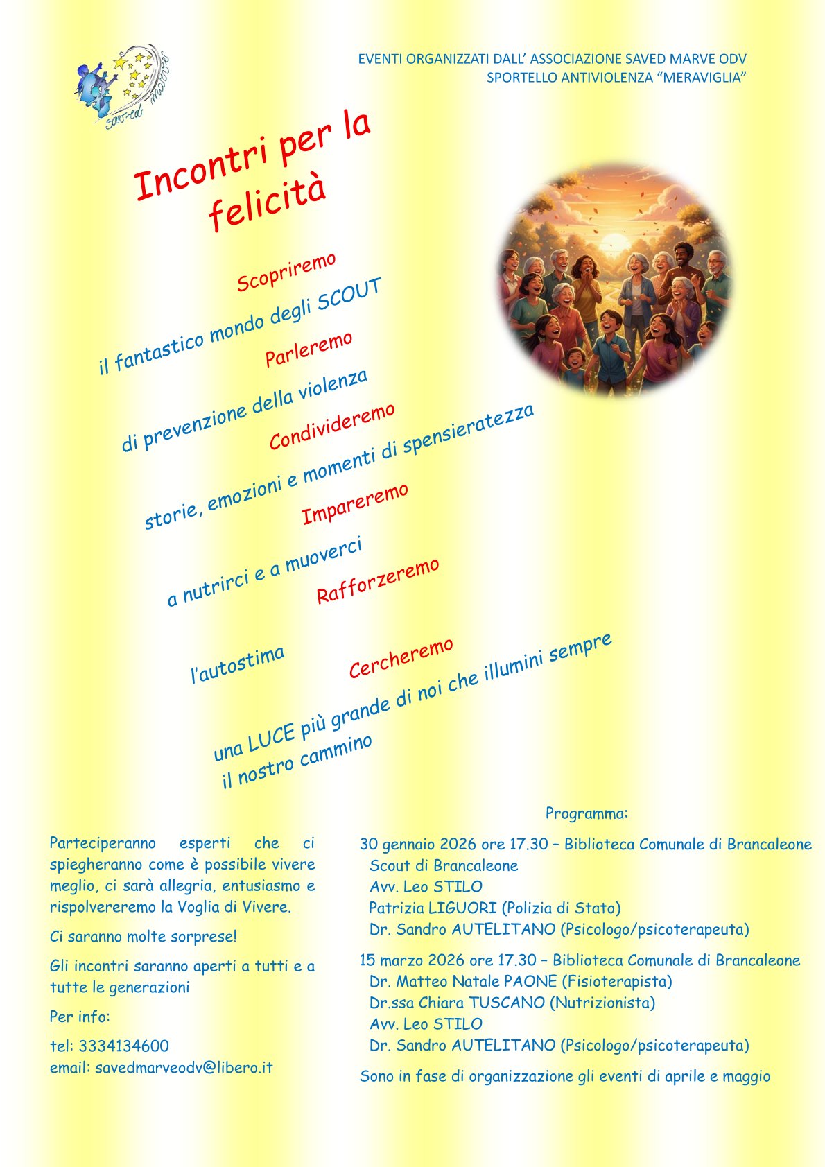 Incontri per la felicità, eventi organizzati da Saved marve ODV Sportello Antiviolenza “Meraviglia”