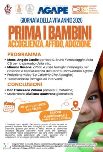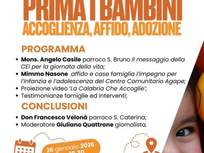 In occasione della Giornata della vita, lunedì 26 gennaio alle ore 18.30 presso il Salone Parrocchiale della Chiesa di Santa Caterina a Reggio Calabria, si terrà l’incontro “Prima i bambini. Accoglienza, affido, adozione”.