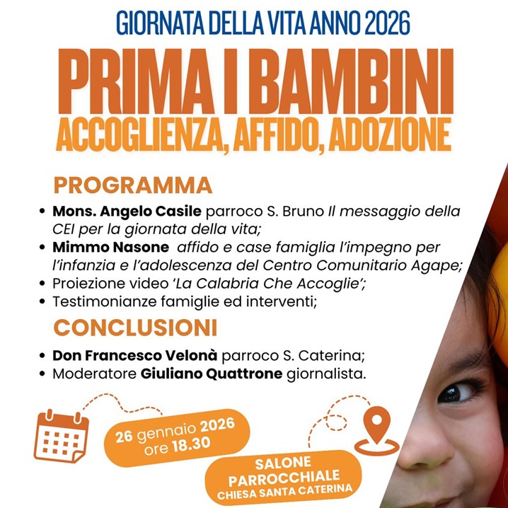 In occasione della Giornata della vita, lunedì 26 gennaio alle ore 18.30 presso il Salone Parrocchiale della Chiesa di Santa Caterina a Reggio Calabria, si terrà l’incontro “Prima i bambini. Accoglienza, affido, adozione”.