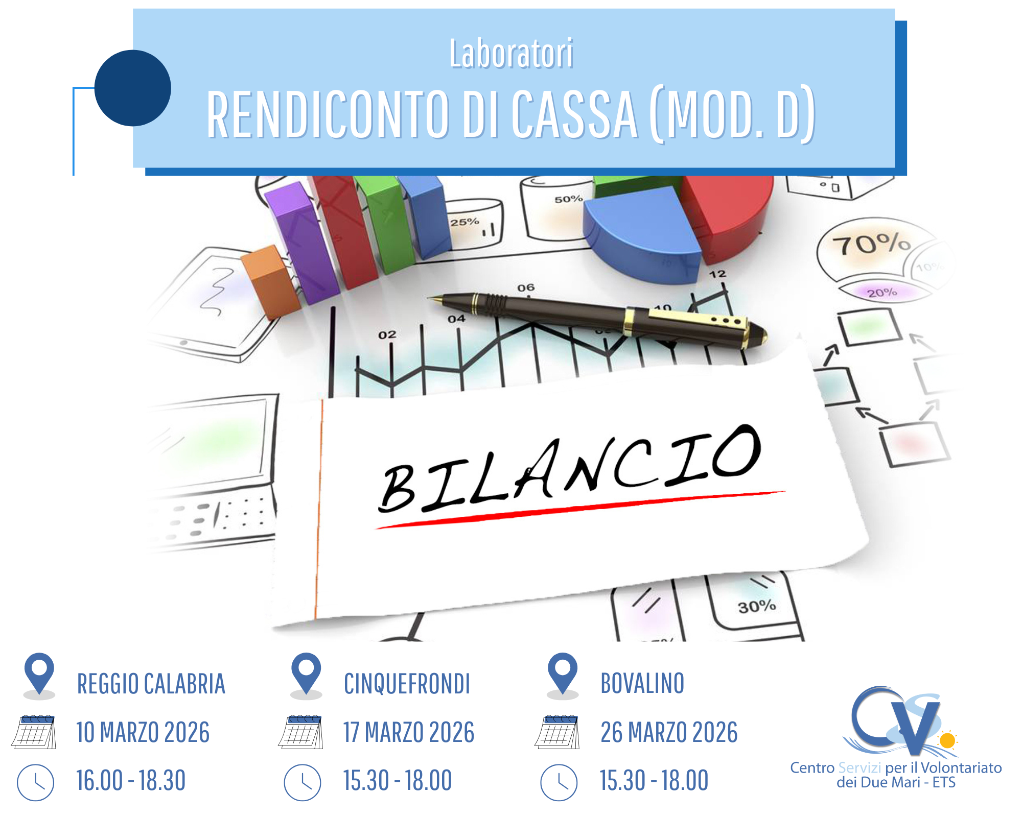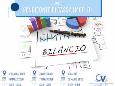 - Reggio Calabria, martedì 10 marzo 2026 dalle ore 16.00 alle ore 18.30 presso la sede centrale del CSV;