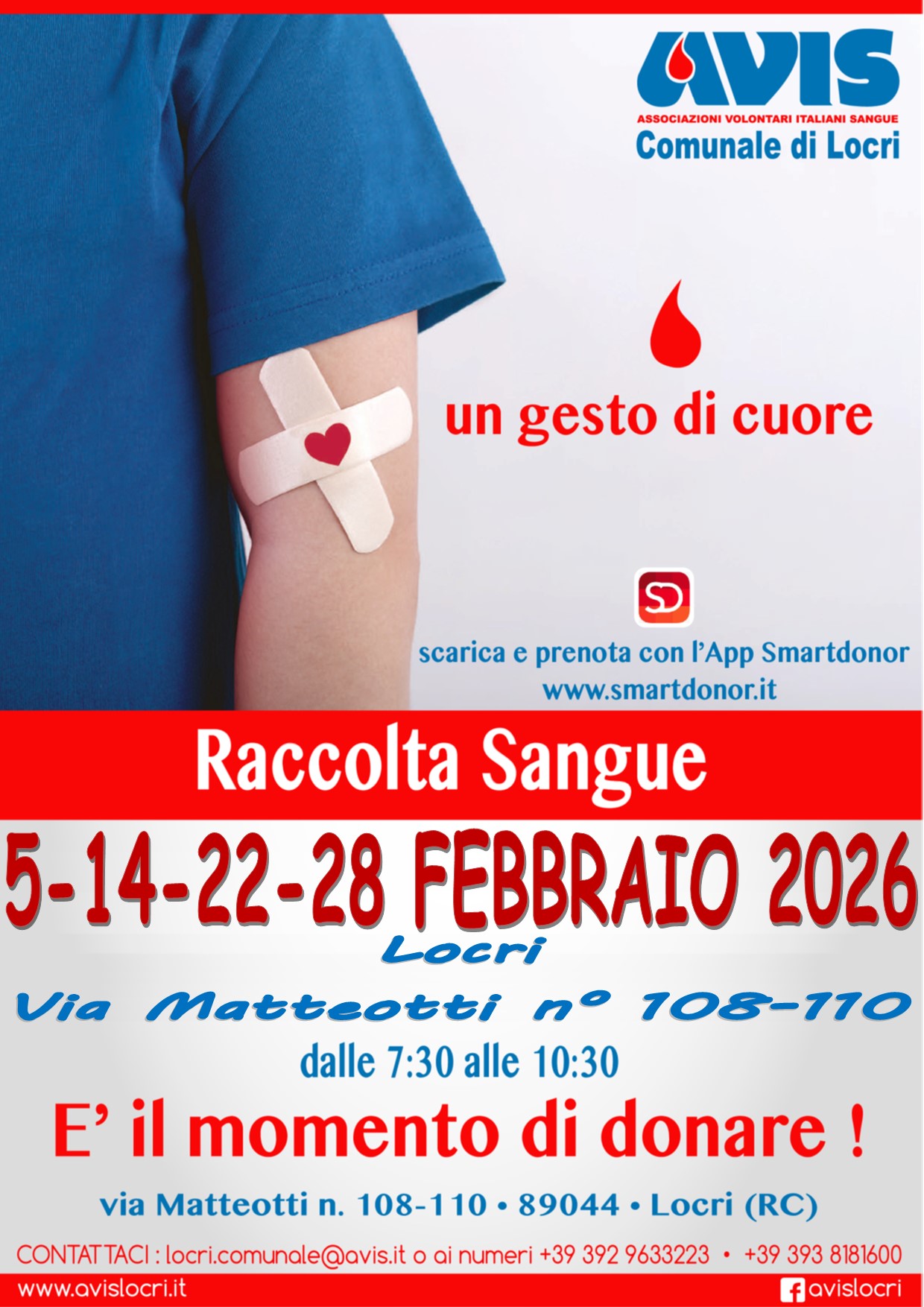 L’Avis Comunale di Locri effettuerà raccolta di sangue nel mese di febbraio nelle seguenti date: