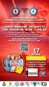 Venerdì 17 aprile 2026 alle ore 15.30 presso l’Auditorium Diocesano “Casa Famiglia fi Nazareth” a Rizziconi, si terrà un evento di formazione e informazione sanitaria dal titolo “La vita è una cosa meravigliosa, proteggiamola insieme”. Il corso, completamente gratuito, riguarda le manovre salvavita con training BLSD/PBLSD ed è rivolto a tutti.