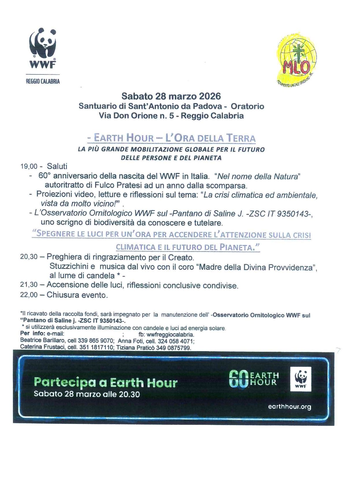 Sabato 28 marzo alle ore 19.00 ci sarà la più grande mobilitazione globale per il futuro delle persone e del pianeta l’Earth Hour – L’ora della Terra. L’evento è organizzato dal WWF di Reggio Calabria e si terrà presso il Santuario di Sant’Antonio da Padova – Oratorio sito in via Don Orione n. 5 a Reggio Calabria.