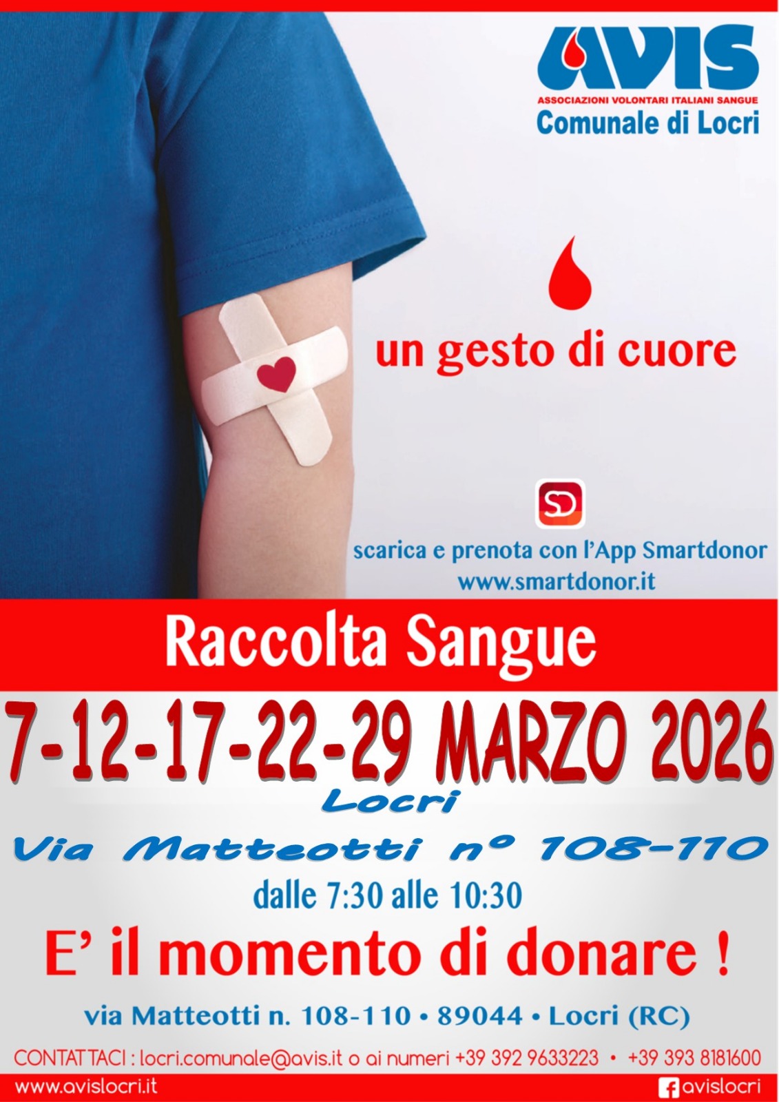 L’AVIS Comunale di Locri comunica le date delle raccolte di sangue per il mese di marzio 2026
