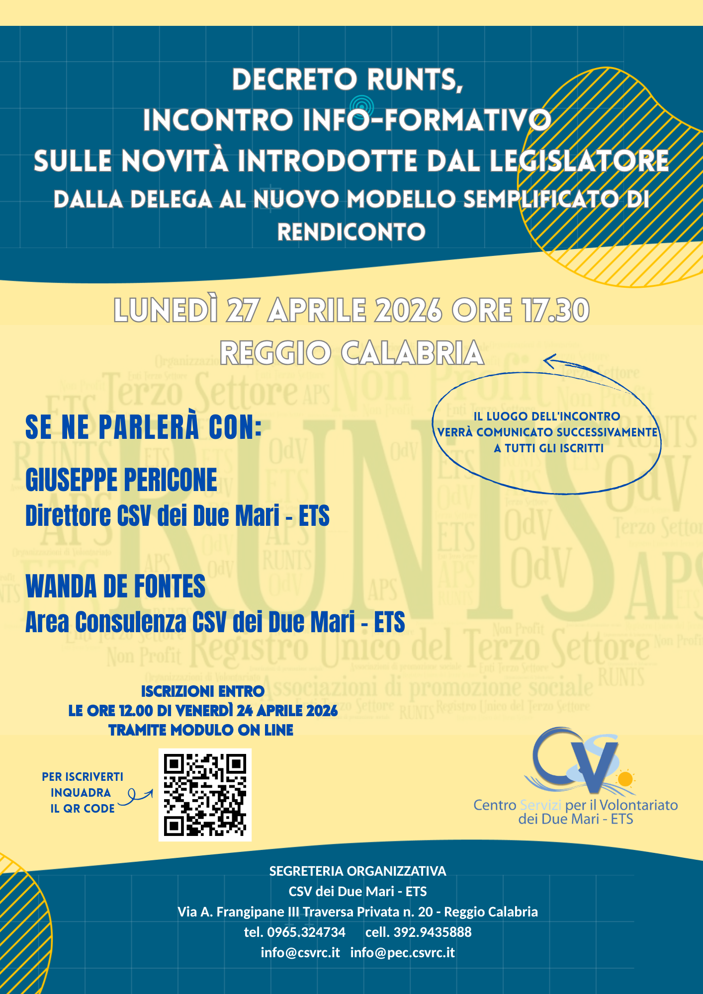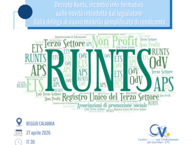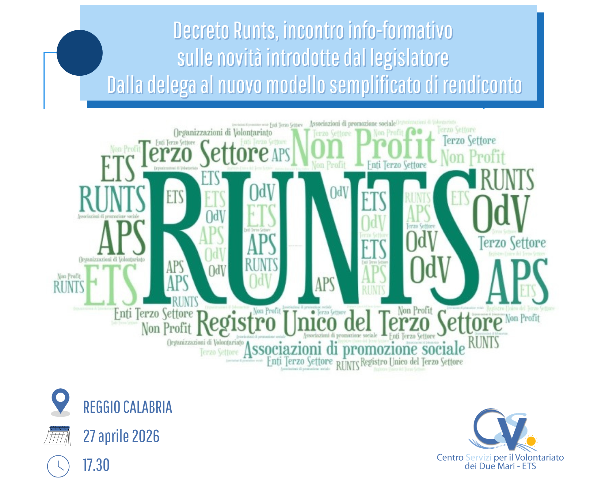 A seguito delle novità riguardanti il decreto sul funzionamento del Runts – dm 106/2020 – introdotte recentemente dal decreto ministeriale n. 2/2026, il Centro servizi per il volontariato dei Due Mari promuove degli incontri info-formativi durante i quali saranno presentate le novità introdotte dal legislatore, tra le quali la possibilità di delegare un soggetto terzo a svolgere le operazioni sul Runts, al modello semplificato di rendiconto (adottabile dal 2027).